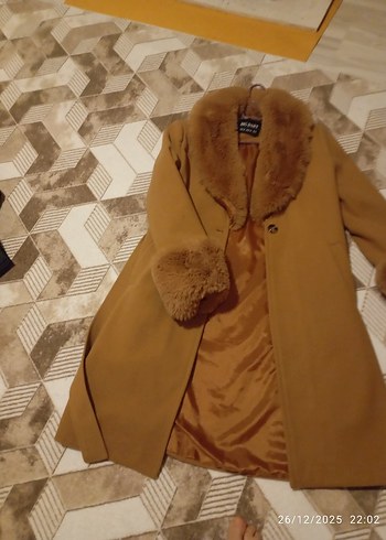 Kahverengi, uzun boy, kürklü yaka ve manşet detaylı kadın kaban. Notch yakalı, düz kesim, yumuşak ve sıcak kumaştan üretilmiştir. Günlük kullanıma uygundur.