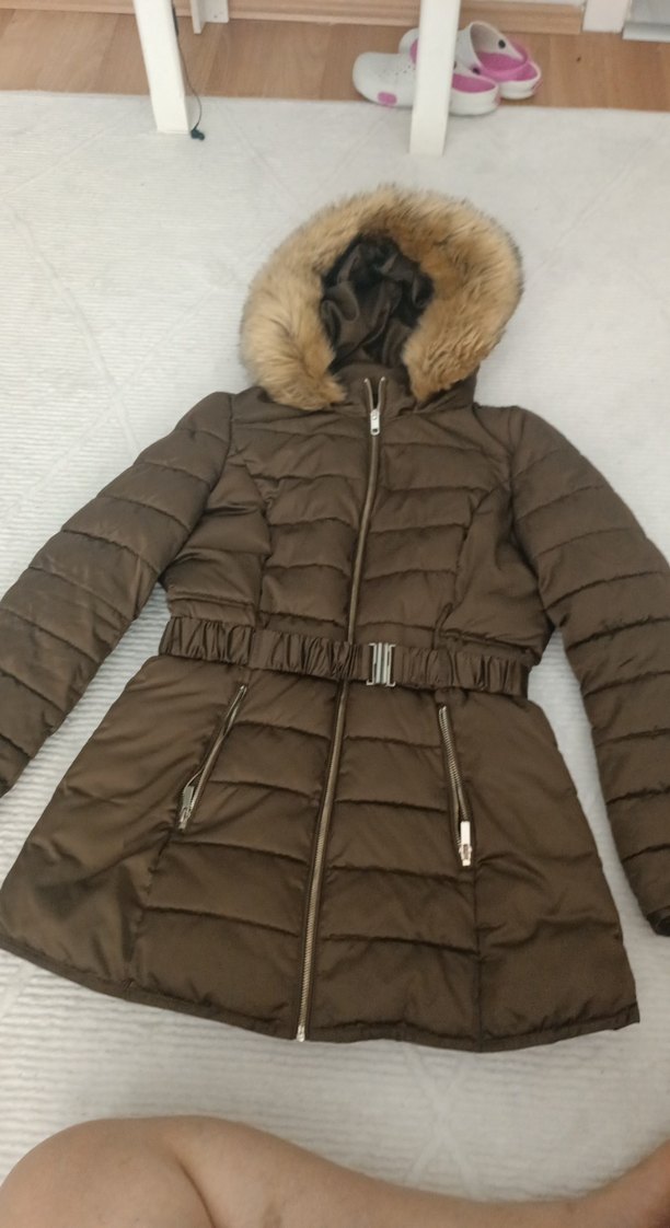 Kahverengi, kürklü kapüşonlu, beli oturan, midi uzunlukta kadın kışlık mont. Sentetik kumaştan, strappy kollu, günlük sokak stili için uygun. ❄️