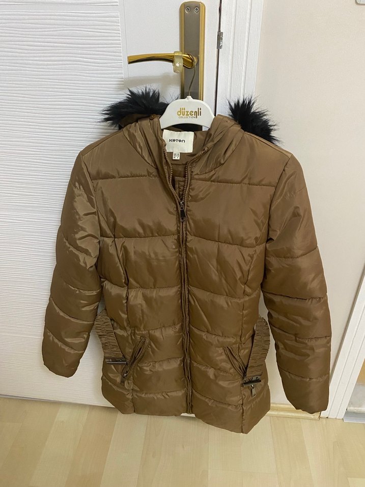 Kahverengi, parlak sentetik kumaştan, kürklü kapüşonlu, uzun kollu, normal boyda, fitted kesim kadın kışlık mont. Sorunu yok