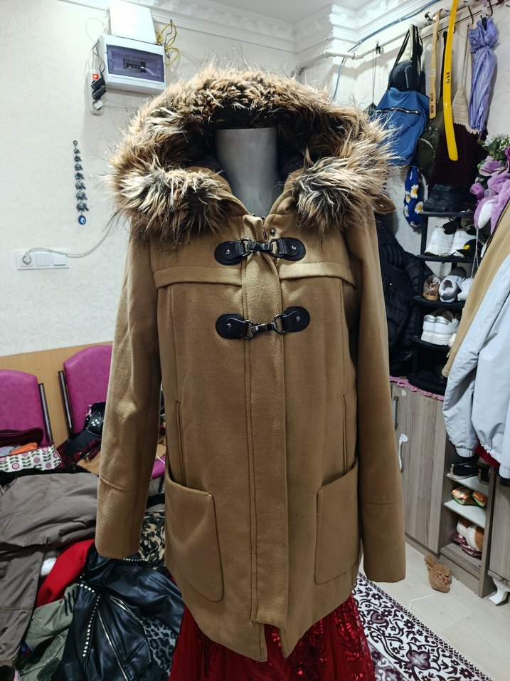 Kahverengi kışlık mont, kürk detaylı kapüşon ve rahat kesime sahiptir. Yumuşak dokulu kumaştan üretilmiş, günlük kullanıma uygundur.
