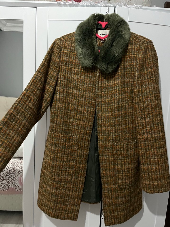 Kahverengi kareli, yumuşak yün kumaştan yapılmış, kürklü yakalı ve normal uzunlukta kadın midi kaban. Ofis için uygun, rahat ve klasik tarzda.