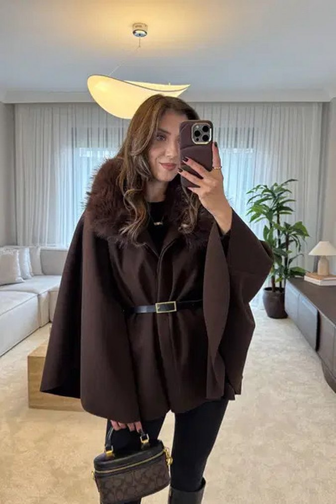 Uzun kollu, yüksek yaka, kahverengi midi panço, yumuşak kürk detaylı. Rahat ve trend sokak stili için uygun. S M L MEVCUTTUR