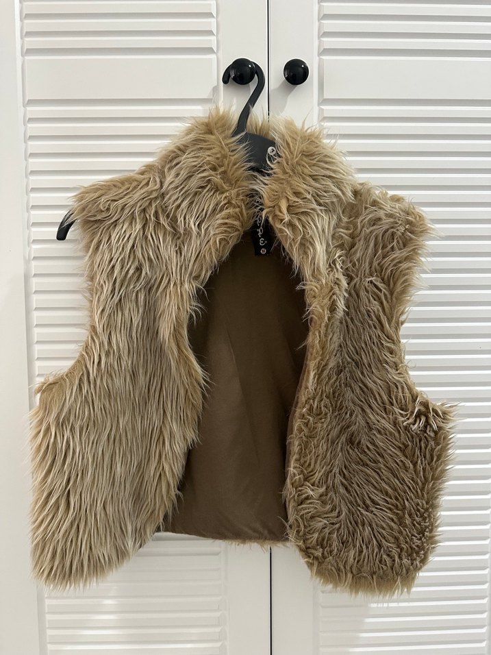 Kahverengi, kolsuz, yumuşak kürk detaylı, dar kesim ve askısız yaka tasarımına sahip yelek. Rahat ve desensiz, günlük kullanım için uygun.