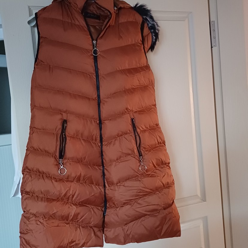 Kahverengi, yakalı ve kürk detaylı, parlak sentetik kumaştan yapılmış, fermuarlı cepli, normal uzunlukta, fitted kesim kadın şişme yelek.
