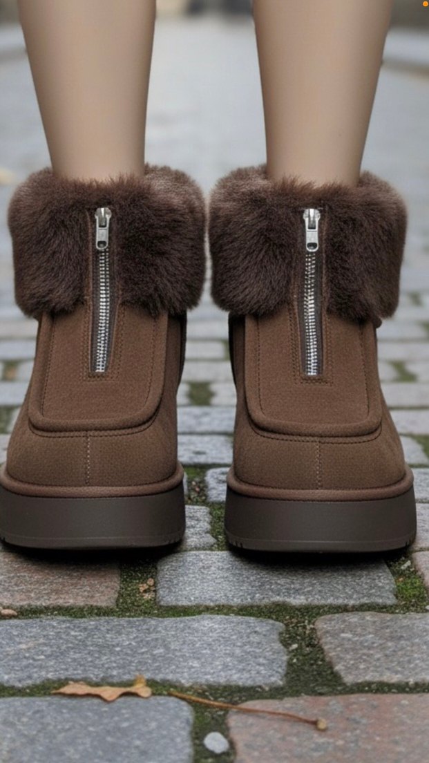 Kahverengi süet malzemeden yapılmış, kürklü detaylı kadın botları. Arkada fermuar ve dolgu topuk bulunur. Günlük ve sokak stili için uygundur.