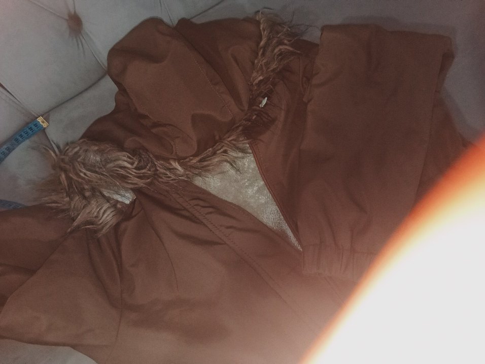 Kahverengi, kürklü detaylı, V yakalı uzun mont. Yumuşak sentetik kumaştan, fitted kesim ve askılı kollu, sokak modasına uygun.