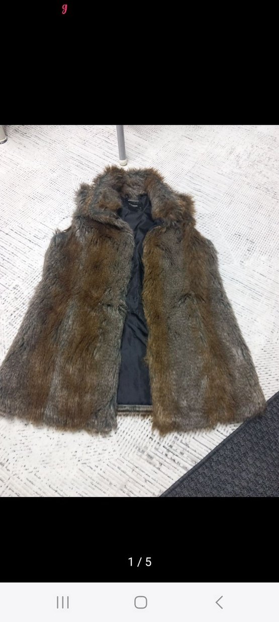 Kahverengi, sentetik kürklü, kolsuz, yakalı ve bohem tarzda dış mekan için uygun, vücuda oturan yelek.