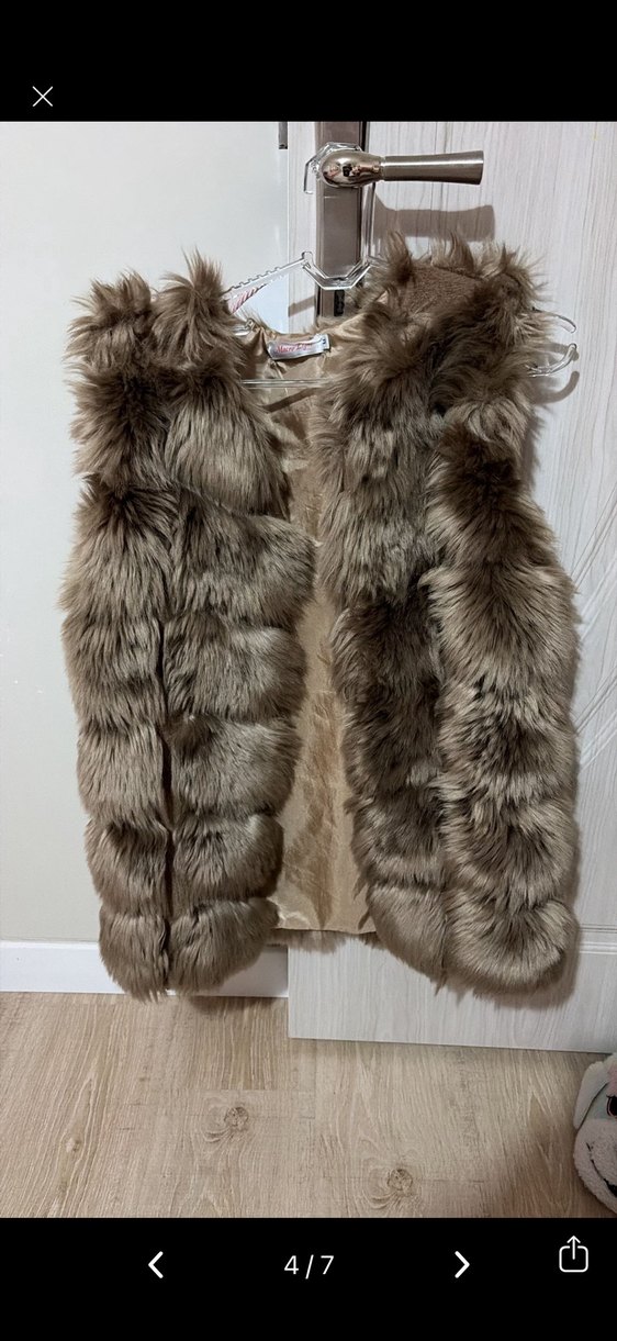 Kahverengi, kürklü, askısız ve vücuda oturan kadın yeleği, yumuşak sentetik kumaştan yapılmıştır. Rahat ve bohem tarz için uygundur.