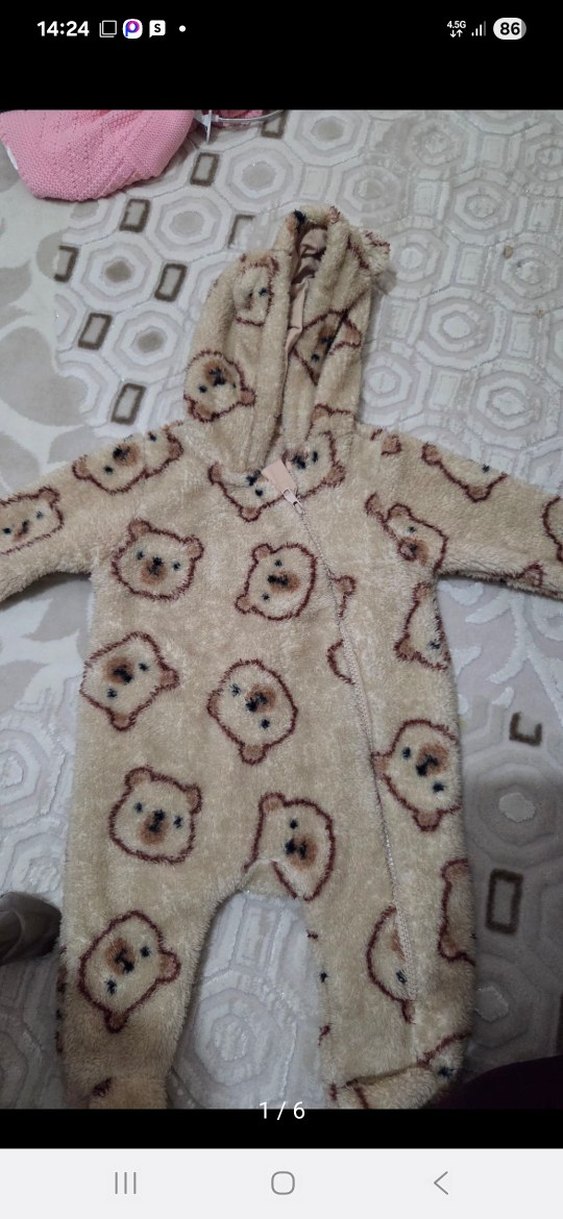 ayı desenli, kapüşonlu ve kürklü kahverengi bebek tulumu. Yumuşak ve sıcak kumaştan üretilmiştir.