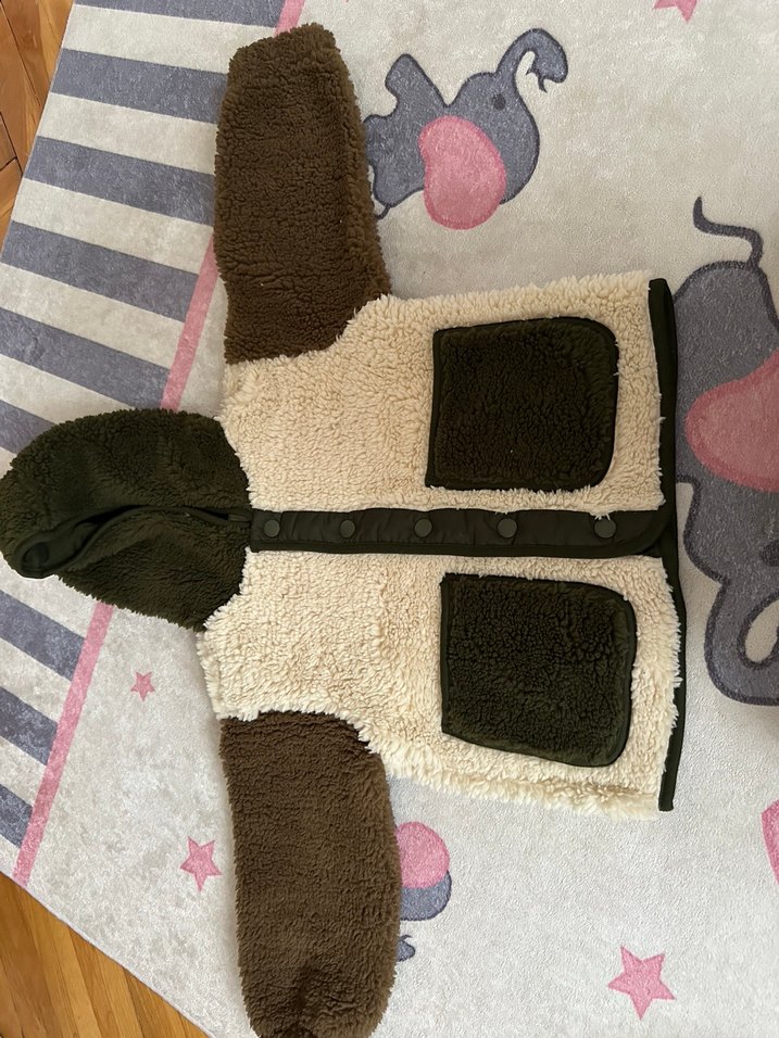 Kahverengi ve krem renklerde, kapüşonlu ve kürk detaylı, yumuşak ve sıcak kumaştan yapılmış, erkek çocuklar için trend sokak stili mont.