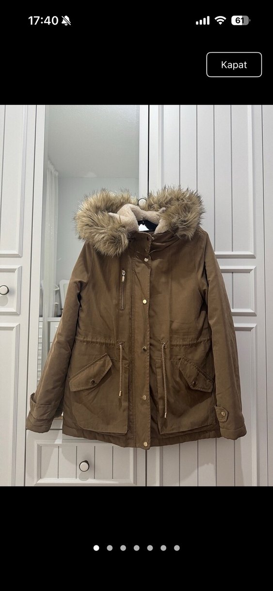 Kahverengi süet kışlık ceket, bol kesim ve kürklü kapüşon detaylı. Askılı kollu, cep detaylı, gündelik kullanıma uygun. S bedenede uyumludur