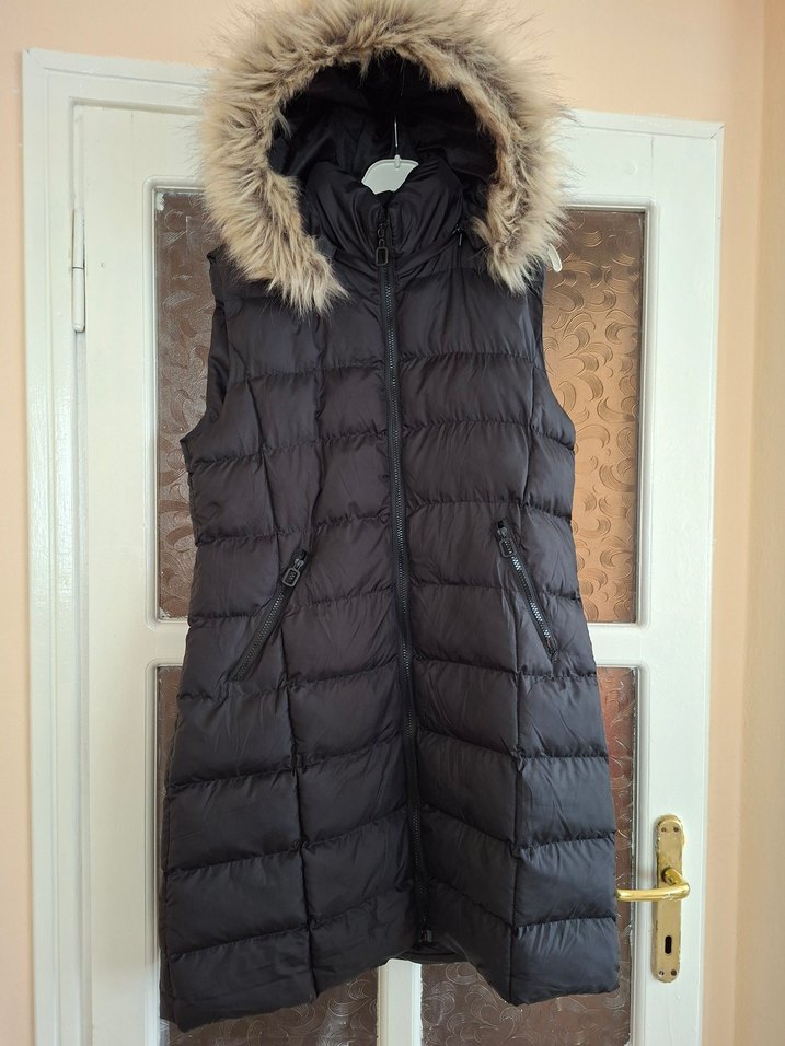 Kahverengi, kolsuz, yüksek yakalı ve kürklü kapüşonlu yelek. Yumuşak kumaştan, normal midi boyda, fermuarlı ceplerle trendy casual tarzda. 1 kaç defa giyildi hiç bir problemi yok kusursuz etikette 38 beden yazıyor ama 40 42 beden ürün