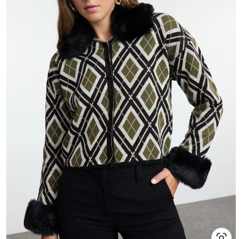Kahverengi kareli desenli, kısa ve fitted kesim kadın ceketi, sentetik kumaş ve yakada ile kollarda kürk detaylarına sahip, günlük sokak stiline uygun. Etiketini koparmış bulundum kendime yakıştıramadım.