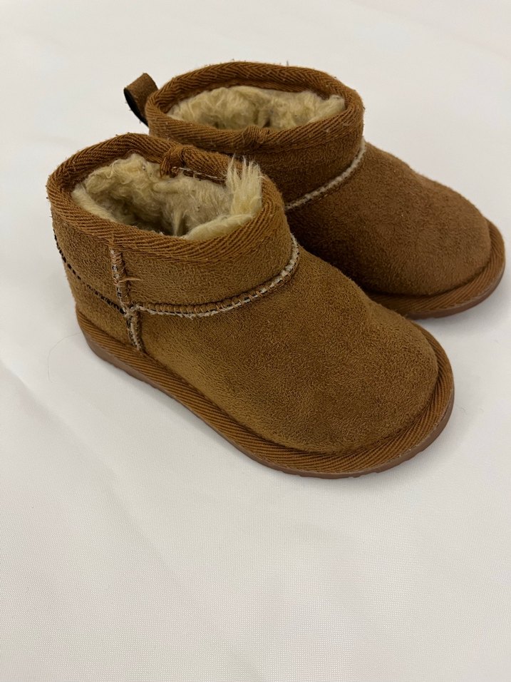 Kahverengi süet kız çocuk botu, iç kısmı yumuşak kürk detaylıdır. Düz tasarımı parlak görünüm ve normcore stil sunar.