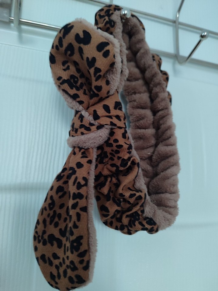 Koyu kahverengi, leopar desenli, yumuşak sentetik kumaştan yapılmış kürklü saç bandı, bohem ve rahat sokak stili için uygundur.