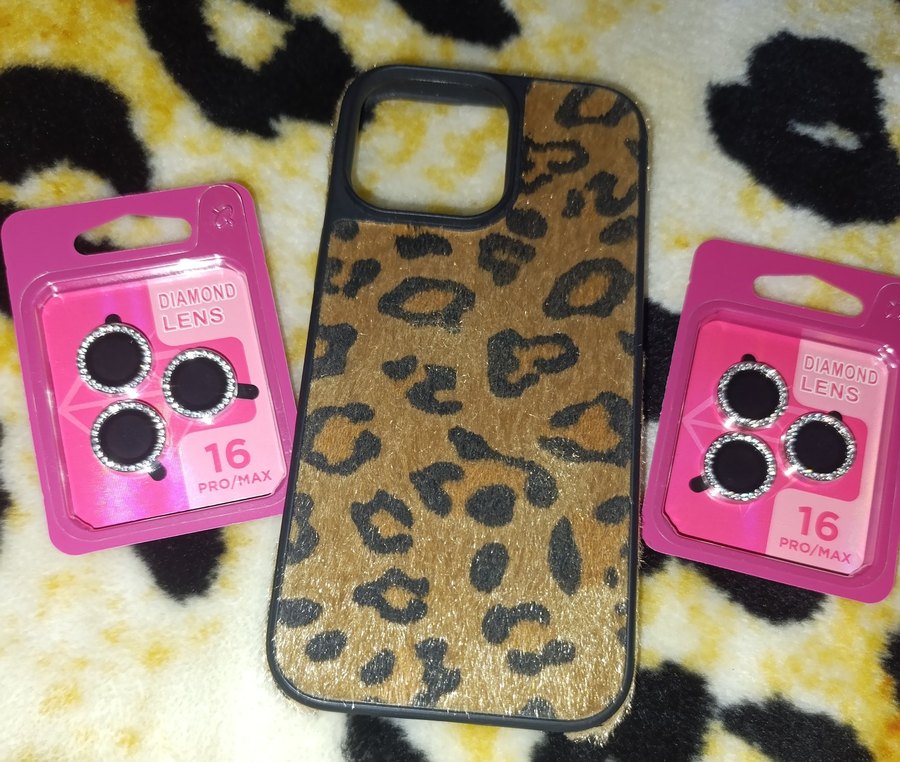 Kahverengi kürk dokusuna sahip, leopar desenli telefon kılıfı. Street wear tarzında ve 16 Pro/Max uyumludur artı 2'li 16 promax taşlı lens koruma fiyatıdır