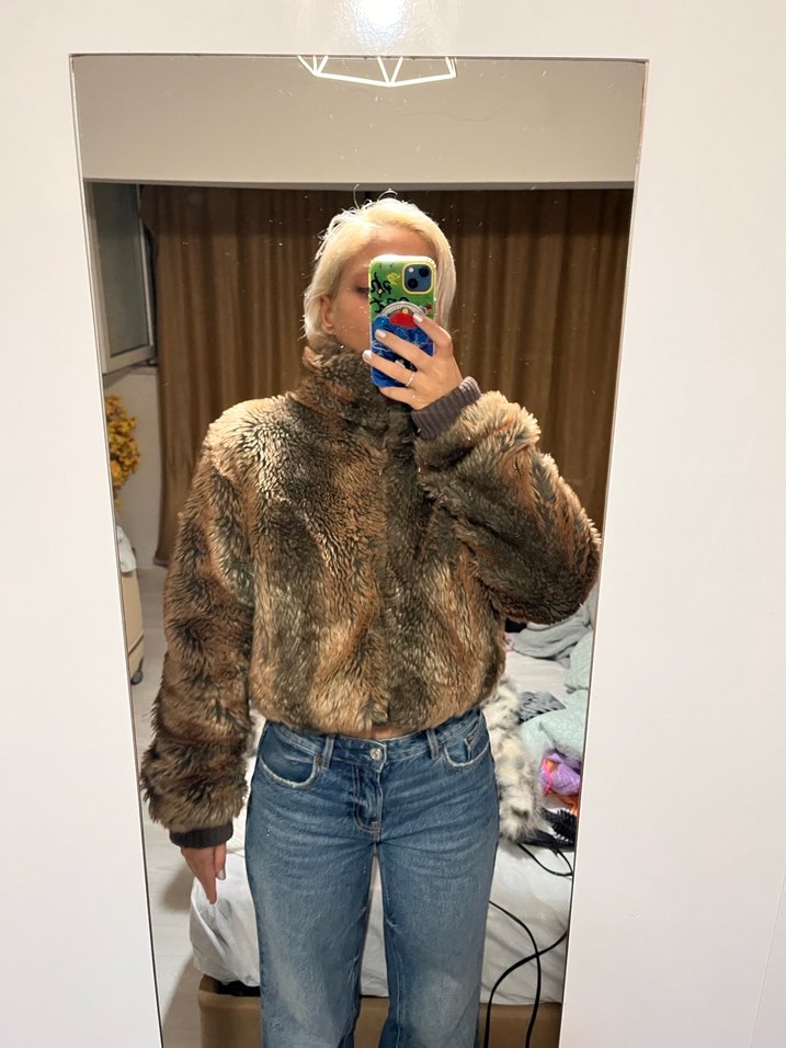 Kolları ve Bel kısmı uzun / kısa ayarlanabilir Yüksek yakalı, uzun kollu kahverengi kürklü, bol kesim ve rahat tüylü dokulu günlük kadın kürk .