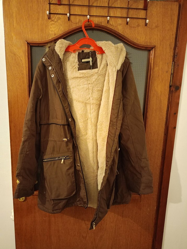 Kahverengi, kürklü iç astarlı, uzun kollu ve normal boy midi kadın ceket. Rahat kesimi ve kürklü detaylarıyla sokak stiline uygun, sıcak tutan bir modeldir.