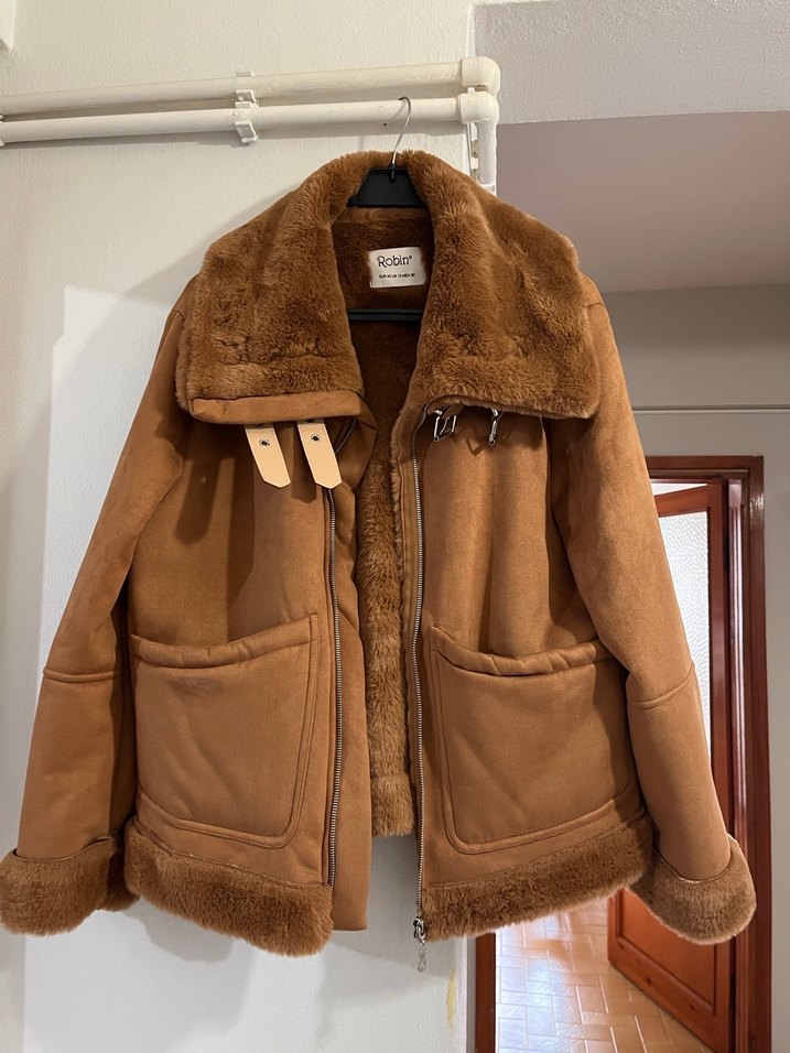 Kahverengi, yumuşak kürklü detaylı midi ceket. Notch yakalı, bol kesim ve askılı kollu, rahat sokak stili için uygun. Günlük kullanım için parlak desenli. Sadece bir kez giydim sıfır dan farkı yok