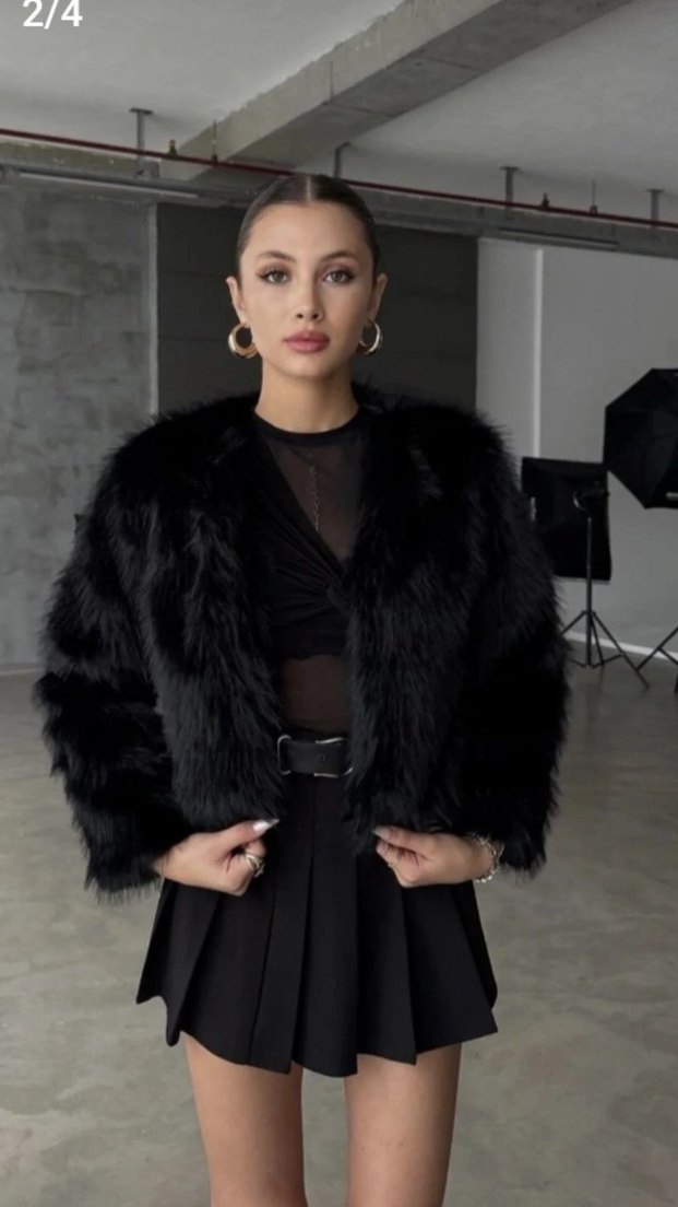 Kahverengi kürklü deri ceket, yüksek yaka ve uzun kollu, bol kesimdir. Midi boyda, kürk detaylı ve günlük kullanıma uygundur.