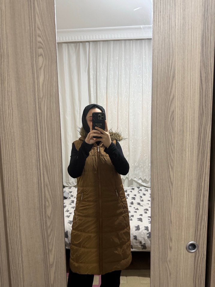 Kahverengi, yüksek yakalı ve kürk detaylı, yumuşak sentetik kumaştan yapılmış, normal boy, kolu olmayan fitted kış yeleğidir. Günlük kullanıma uygundur.