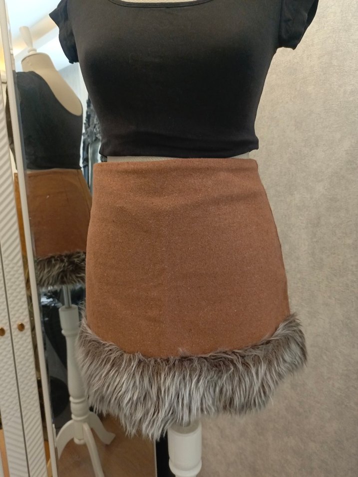 Kahverengi, kısa ve vücuda oturan mini etek, yumuşak ve sıcak kumaştan yapılmıştır. Etek ucu kürk detaylıdır, rahat ve bohem bir tarza sahiptir.