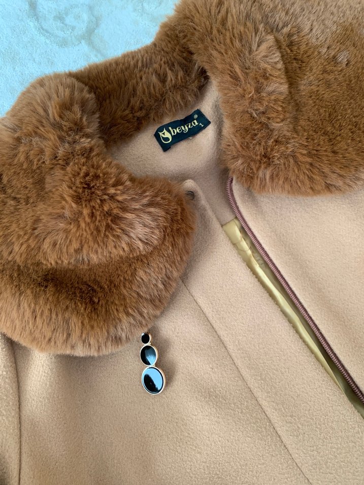 Yumuşak kumaştan yapılmış, parlak kahverengi detaylı kürklü yakalı, dar kesim mini mont. Bohem ve retro tarzına uygun, günlük kullanım için ideal.