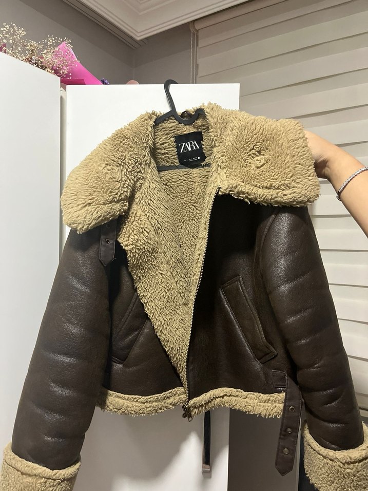 Kahverengi deri, kürk detaylı, notlu yaka ve dar kesimle günlük rahat ve şık sokak stili sunar.