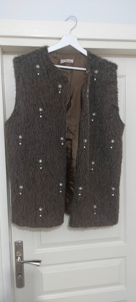 Kahverengi Kürklü Nakışlı Kadın Yelek