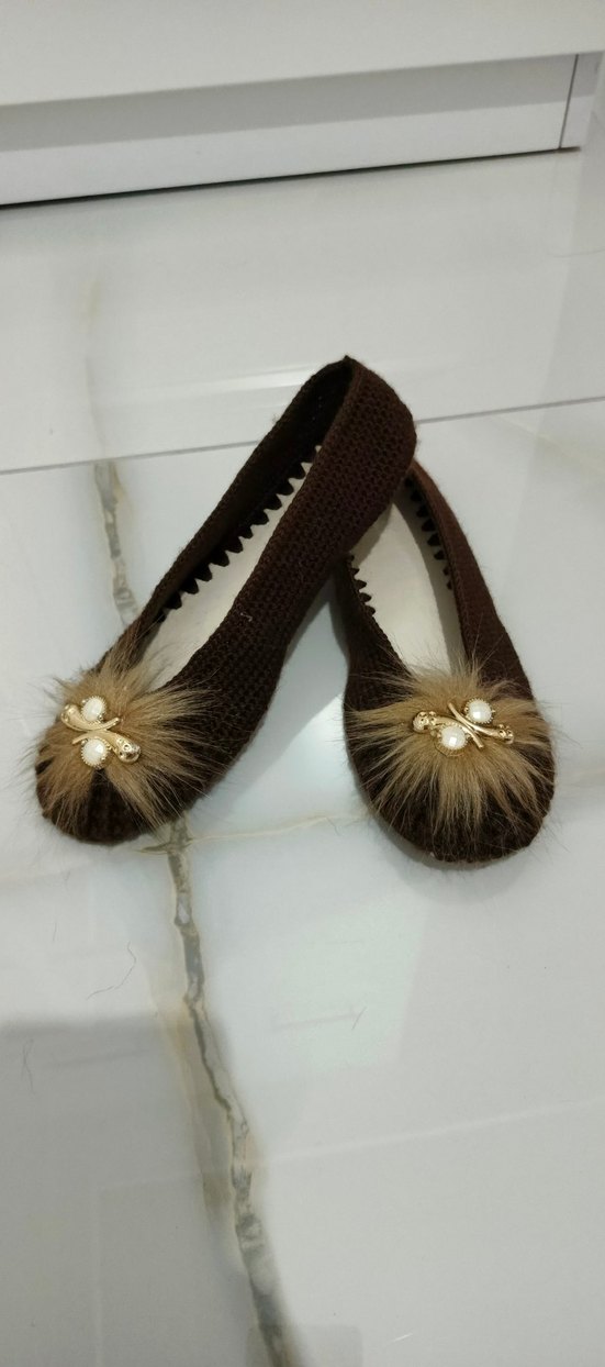 Kahverengi örgü kadın terlikler, kürk detaylı ve nakışlı desenlere sahip olup,keçe tabanlidir