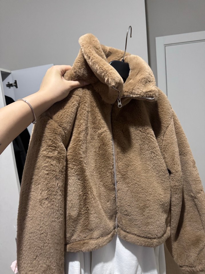 Yüksek yakalı, uzun kollu ve bol kesimli kahverengi ceket. Yumuşak ve sıcak kumaştan, kürk detaylı ve fermuarlı. amerika’dan alındı fazla kürküm olduğu için satıyorum .