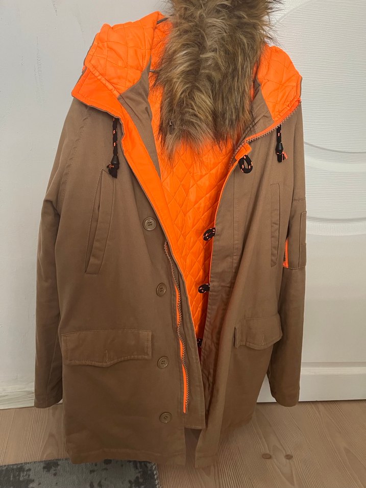 Kahverengi erkek ceketi, kürklü yakası ve parlak turuncu kapitone astarıyla dikkat çeker. Rahat kesim, uzun kollu ve içi yumuşak kumaşlıdır, dış mekan kullanımı için uygundur.