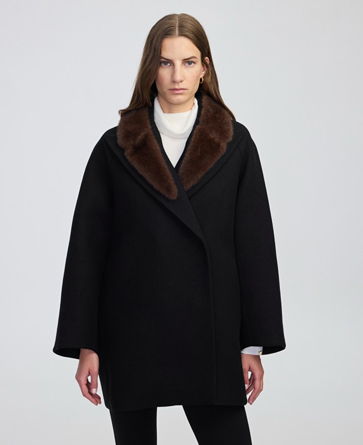 Kahverengi kürklü yaka detaylı, uzun kollu siyah kaban. Rahat kesimiyle sıcak tutar ve şık bir görünüm sunar.