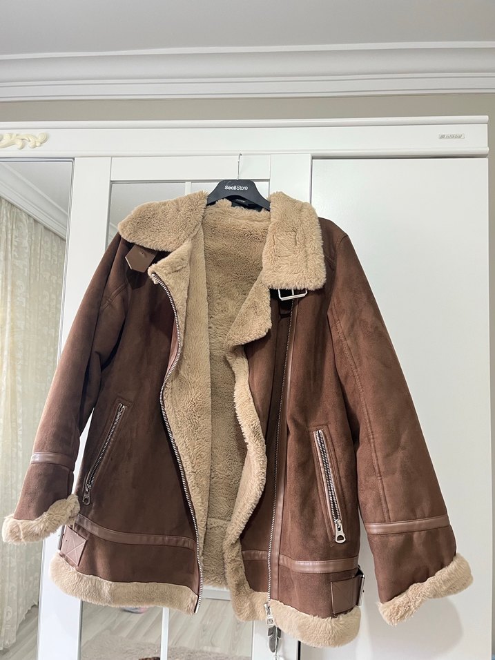 Kahverengi süet ceket, kürklü detaylar ve kesik yaka içerir. Salaş kesim, askılı kollar ve midi boyuyla gündelik sokak stiline uygundur.