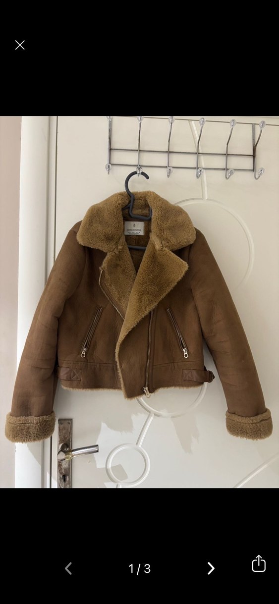 Stradivarius Kahverengi süet, kürklü yakalı ve manşetli, fitted kesim, günlük kullanıma uygun parlak ve rahat sokak stili ceket.
