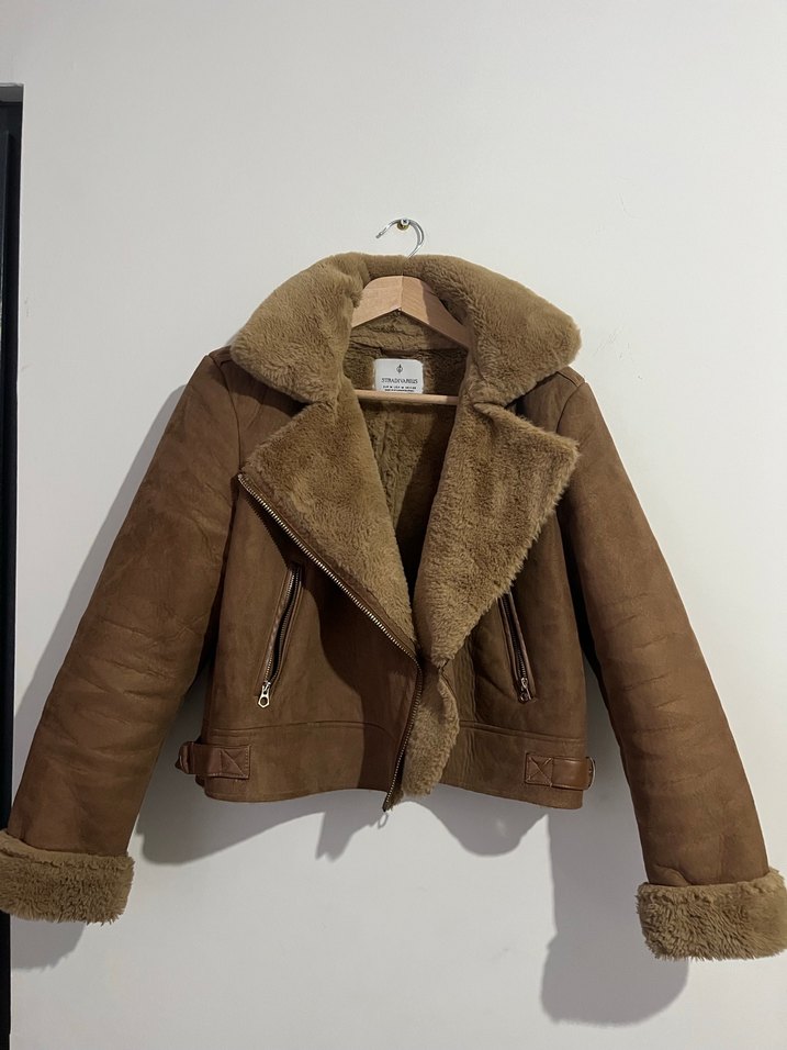 Kahverengi süet kadın ceket, kürklü yakası ve manşetleri ile dikkat çeker. Fermuarlı cepleri ve normal uzunlukta, tertemiz çok az kullanıldı tek bir yerinde en ufak deformasyon yoktur.