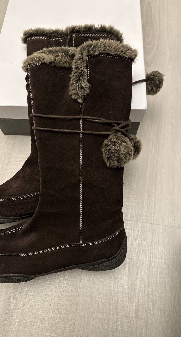 Kahverengi süet malzemeden, kürk detaylı ve dolgu topuklu kadın dizüstü botları, rahat ve gündelik kullanım için uygundur.