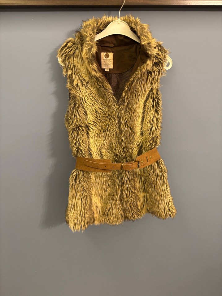 Yumuşak kürklü detaylara sahip kahverengi süet, kolsuz ve yakalı kadın yeleği. Parlak yılan desenli ve belde kemerli, midi boyda, bohem tarzda rahat bir üründür.