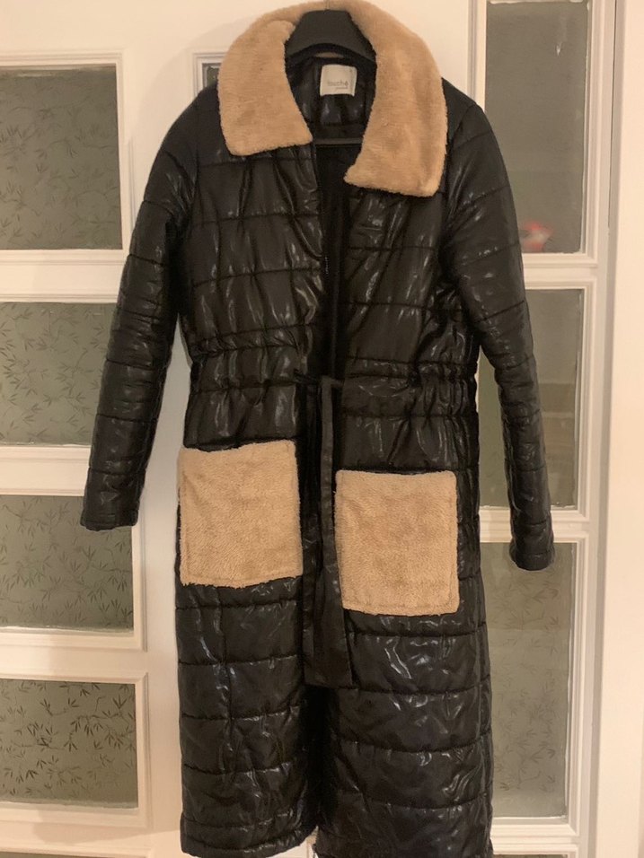 Bu kadın uzun deri kışlık mont, rahat kürk yakası ve büyük ön kürk cepleri ile dikkat çeker. Regular fit ve kesik yaka tasarımına sahiptir.