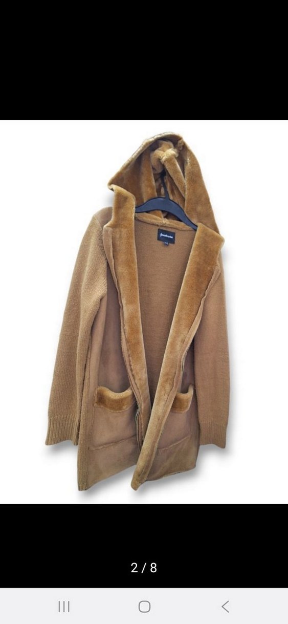 Kahverengi uzun kadın kaban, yumuşak fleece kumaş ve kürk detaylarla sıcaklık sağlar. Notlu yaka ve uzun kolludur, günlük rahat kullanıma uygundur. M beden L bedene uyumlu