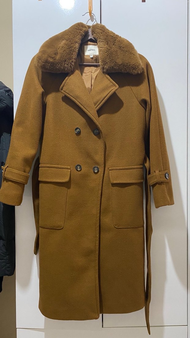 Kahverengi yün kaban, kürklü sivri yakaya ve çift sıra düğmeli ön tarza sahiptir. Uzun boy, askılı kollar ve rahat kesimle günlük sokak modasına uygundur. Sıcak ve şık, koyu renkte desensiz tasarım.