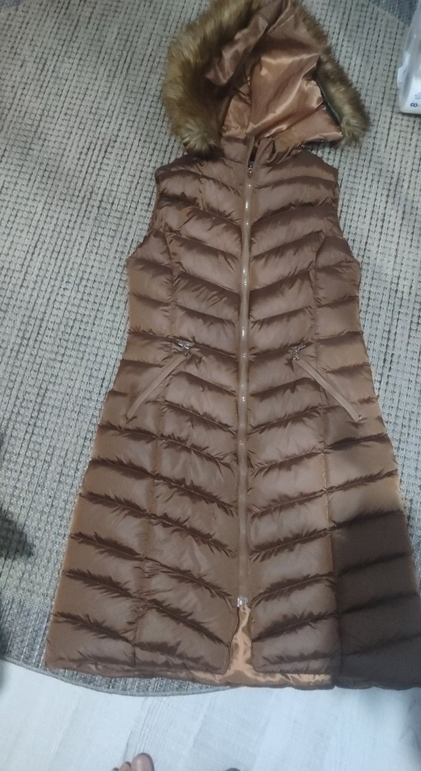 Kahverengi, uzun, kolsuz, V yaka ve kapüşonunda kürk detaylı, yumuşak sentetik kumaştan yapılmış, rahat ve şık kesime sahip kadın yeleği.