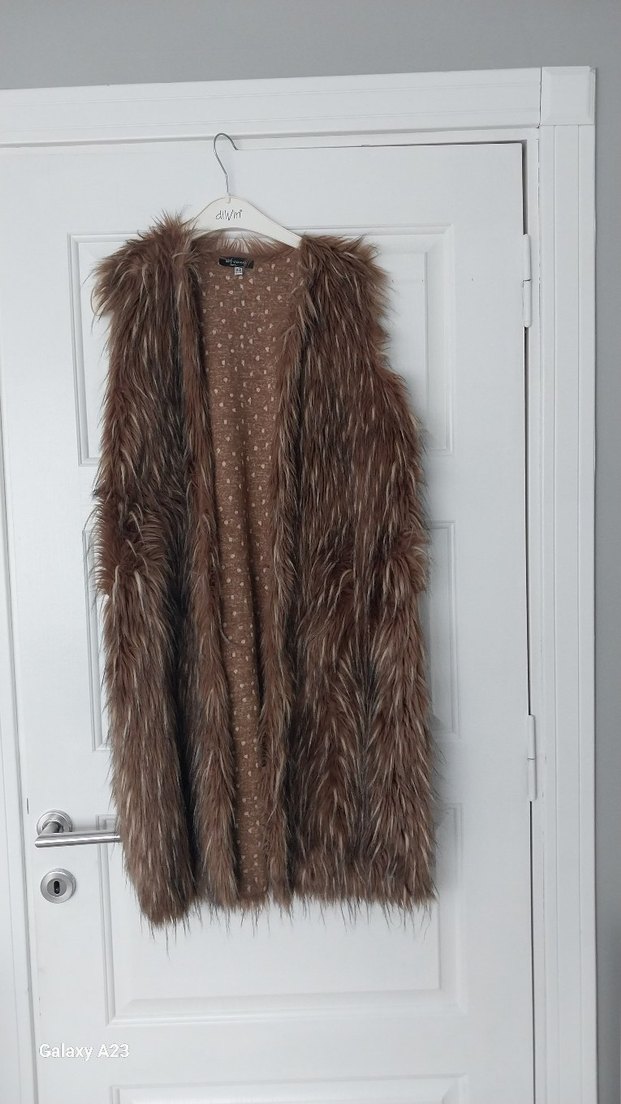 Kahverengi, kürklü detaylı uzun kadın yelek. Rahat kesimi ve yumuşak sentetik kumaşıyla bohem tarzına uygun, kolsuz ve desensizdir. ☁️