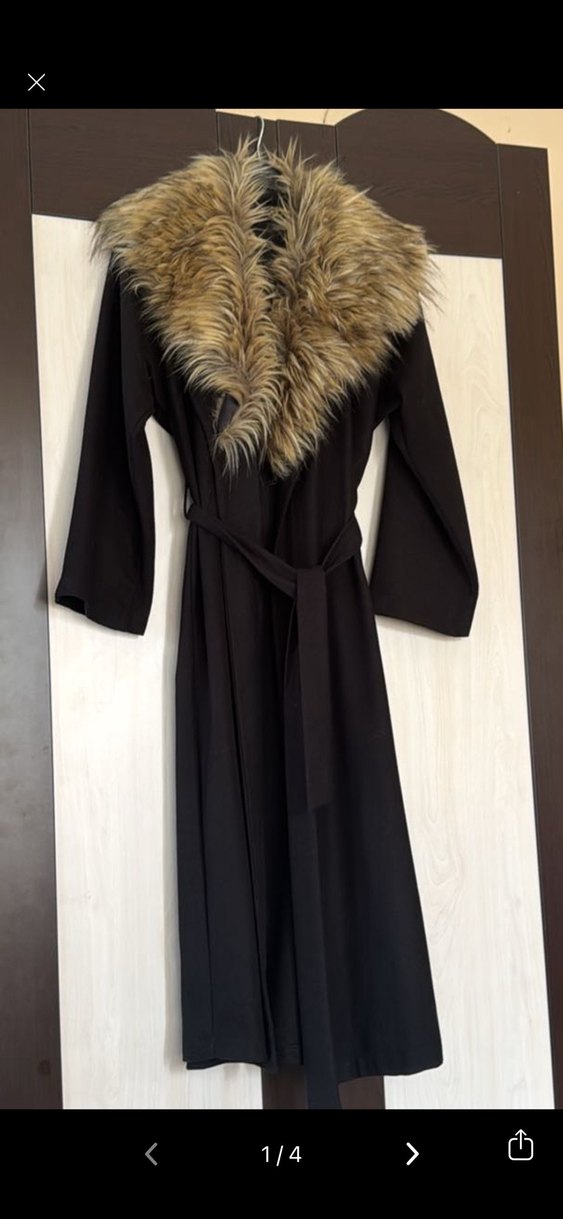 Kahverengi kürklü yaka ve kemer detayına sahip uzun kollu şık kaban.