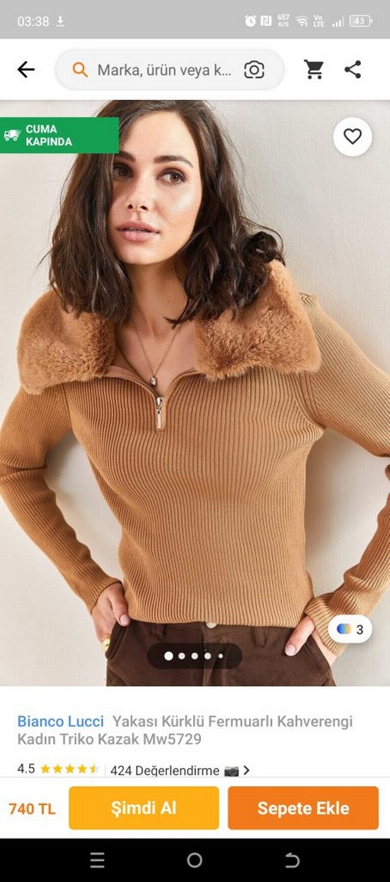 Kahverengi, kürklü yakalı, uzun kollu, yumuşak yün kumaştan yapılmış, vücuda oturan bir kadın trikosudur. Sokak stili ve günlük kullanıma uygundur.