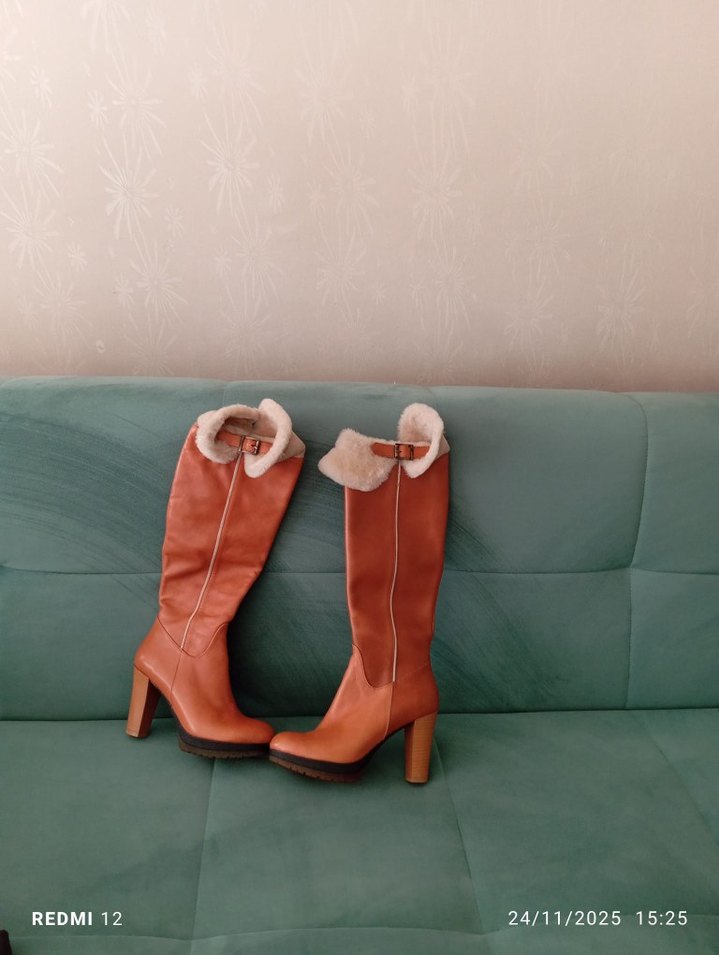Kahverengi deri, yüksek topuklu diz boyu kadın çizme, kürk detaylı. Trendy ve rahat sokak stili için uygun, günlük kullanıma ideal.