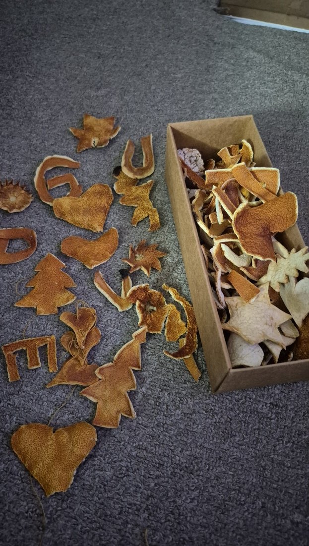 Kahverengi kurutulmuş kalp, ağaç ve çeşitli figürlerden oluşan süsleme seti. Karton kutuda paketlenmiştir.