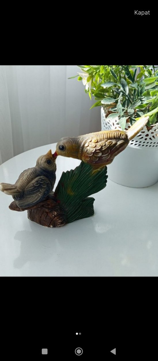 İki kahverengi kuşun yeşil yaprak üzerinde detaylı dokularla tasarlandığı dekoratif figür.
