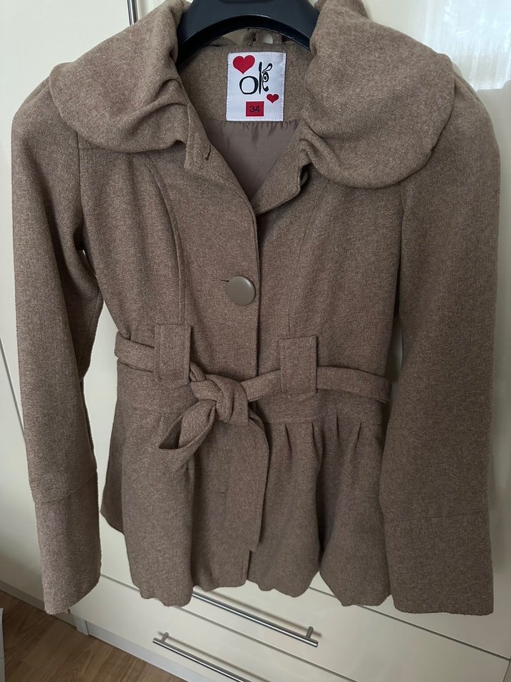 Geniş yakalı ve kuşaklı kahverengi kaban. Uzun kollu ve düğmeli, şık ve sıcak bir dış giyim seçeneği. Kol düğmelerinden bir tanesi yok