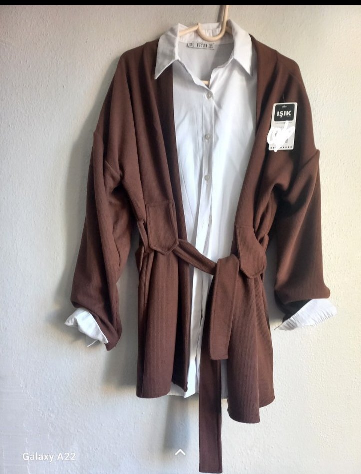 Kahverengi, kuşaklı ve bol kesim ceketi. Pamuk kumaştan, uzun kollu ve notlu yakalı, günlük rahat kullanım için uygundur. beyaz gömlek dahil değildir? ikili kombin